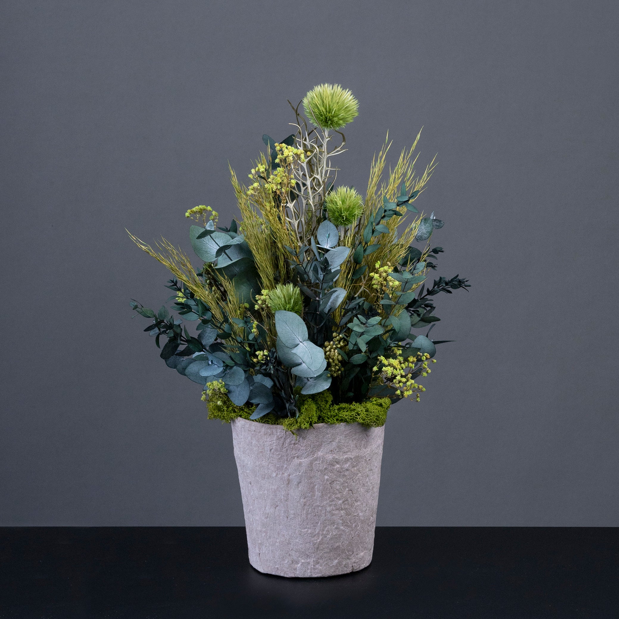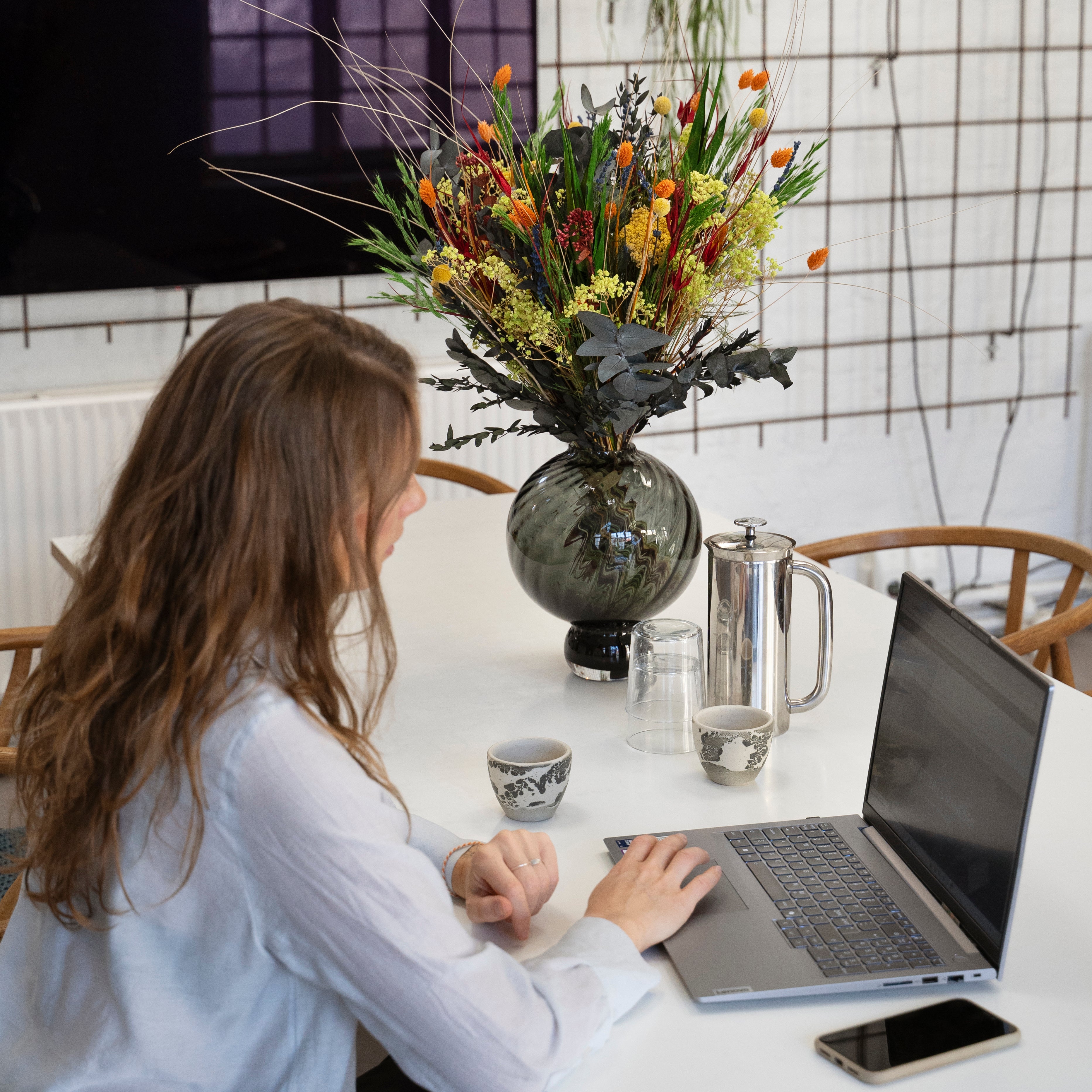 Våre langtidsholdbare blomster holder i minst 6 måneder. De bevarer både form og farger over tid, uten behov for vann eller vedlikehold.