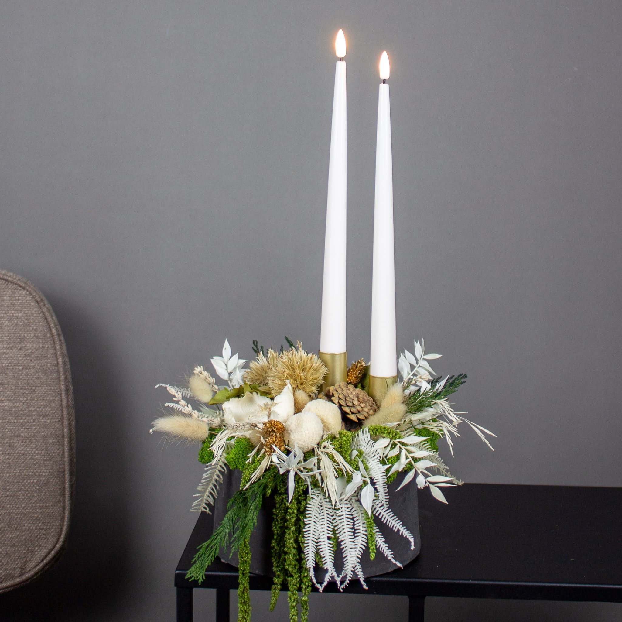 Våre juleblomster i røde og grønne farger har et klassisk uttrykk som passer perfekt inn i et tradisjonelt interiør med antikke møbler, varm belysning og klassisk pynt, og som skaper en følelse av nostalgi og glede som kun julen kan gi. Vår røde julebukett Julemagi og vår dekorasjon Julehjerte er perfekte for å skape en klassisk julestemning. De kan plasseres på spisebordet som et imponerende midtpunkt for å fange oppmerksomheten til gjestene under julemiddagen - bruk dem sammen med klassisk juleservise i røde og grønne farger for en komplett look. Julebuketten og dekorasjonen er også perfekt til å skape en hyggelig krok med julepynten du liker best. Juledekorasjonen vår leveres med to lysestaker, slik at du kan velge dine favorittlys. Du kan sette på lys i vakre julemotiver og -farger eller holde det minimalistisk med hvite lys. Du kan også velge å ta av den ene lysestaken og sette et kalenderlys i den andre.