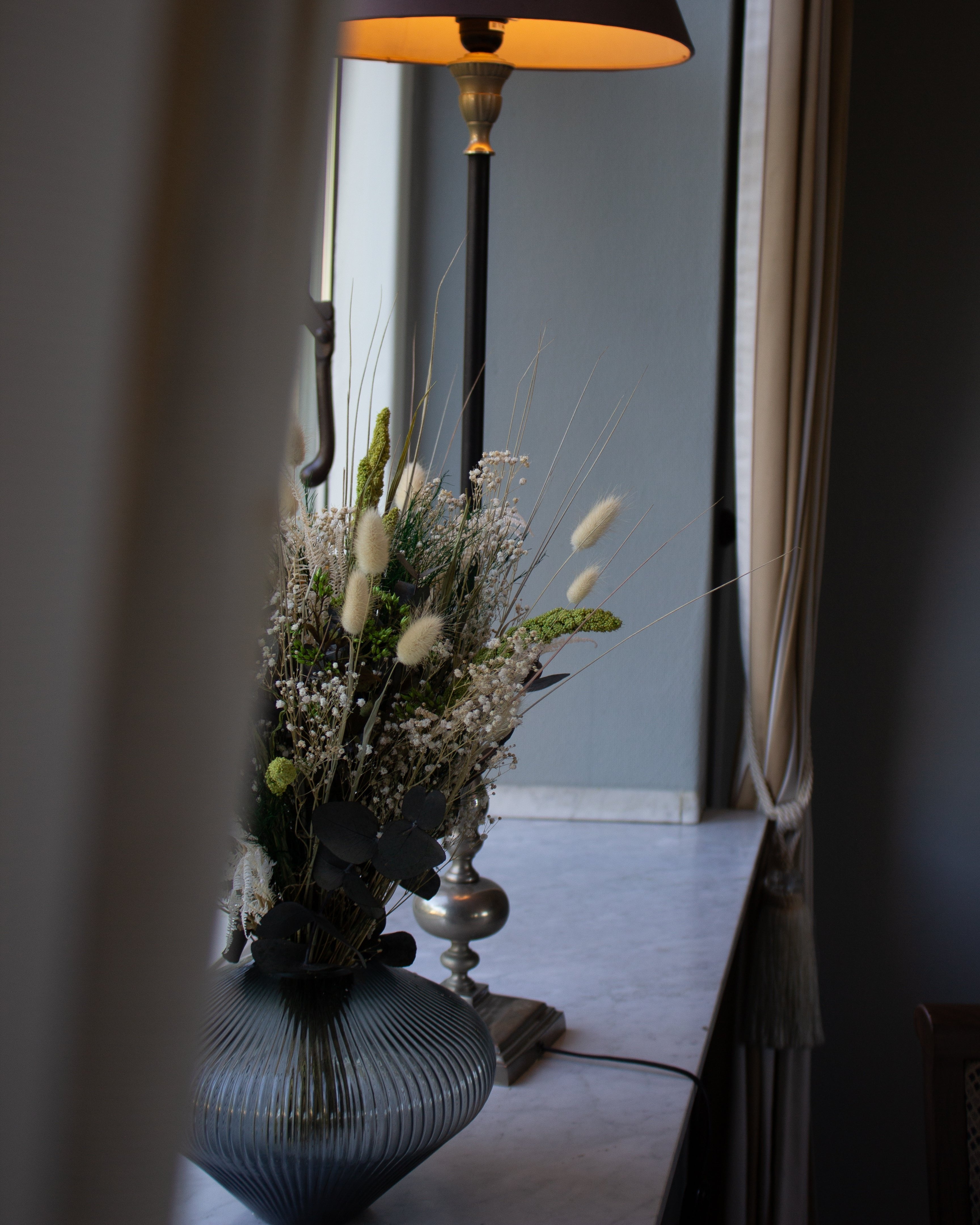 Stuen er ofte hjemmets hjerte, der vi samles for å slappe av og nyte hverandres selskap. Her kan langtidsholdbare buketter og dekorasjoner i høstens varme nyanser være det perfekte fokuspunktet på sofabordet, skjenken eller hyllen. Kombiner gjerne buketten med vakre lysestaker i varme metaller som messing eller kobber. Lysene vil kaste et mykt lys over blomstene og skape en koselig atmosfære som sprer seg i hele rommet.