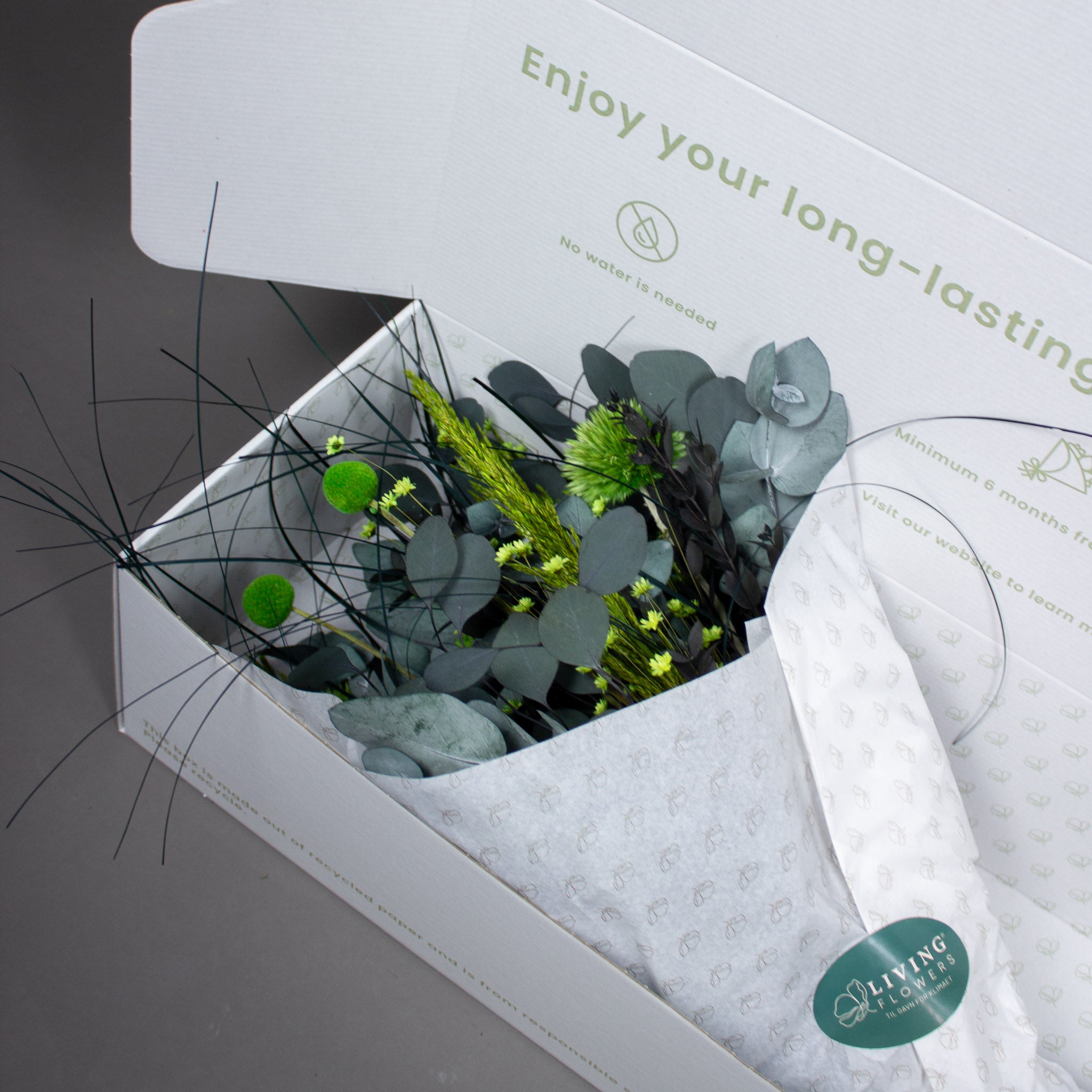 Hos Living Flowers får du blomsterbuketter laget av 100 % naturlige blomster, dyrket under åpen himmel i Europa. Etter høsting står de i en biologisk nedbrytbar plantenektar som forlenger holdbarheten og lar blomstene beholde sitt myke, levende uttrykk. Det gjør bukettene til et langtidsholdbart alternativ til både friske blomster og tradisjonelle tørkede blomsterbuketter.