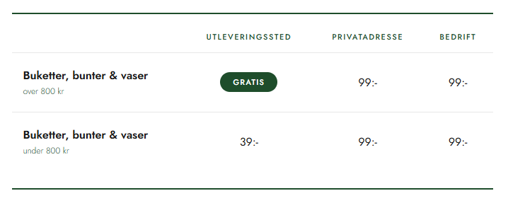 Bestillingen leveres innen 2-5 dager. Pakken leveres på hverdager og på lørdager ved utvalgte leveringssteder. PostNord leverer ikke på søndager og helligdager. Du vil få muligheten til å velge utleveringssted, under betalingsprosessen, når du bestiller en bukett.