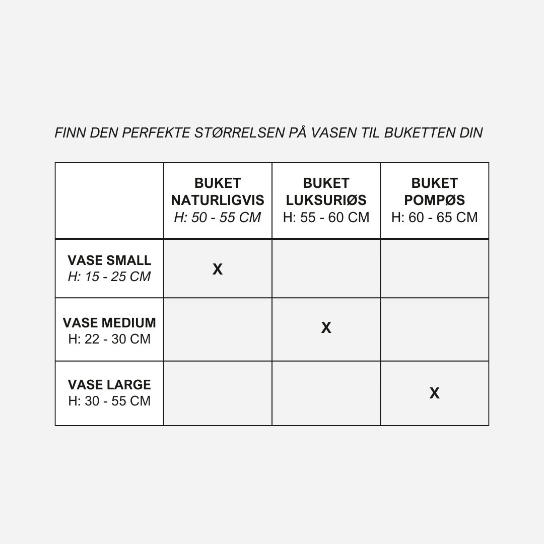 Er du usikker på hvilken bukettstørrelse som passer hjemme hos deg, eller hvilken vase som vil fremheve blomstene dine på best mulig måte? Den rette kombinasjonen kan utgjøre en stor forskjell i innredningen din. Vi guider deg gjennom valg av den perfekte bukettstørrelsen og vasen, og gir deg stylingtips som hjelper deg med å få mest mulig ut av blomstene dine. Våre anbefalinger er selvsagt veiledende - du velger selv hva som passer best til din stil.