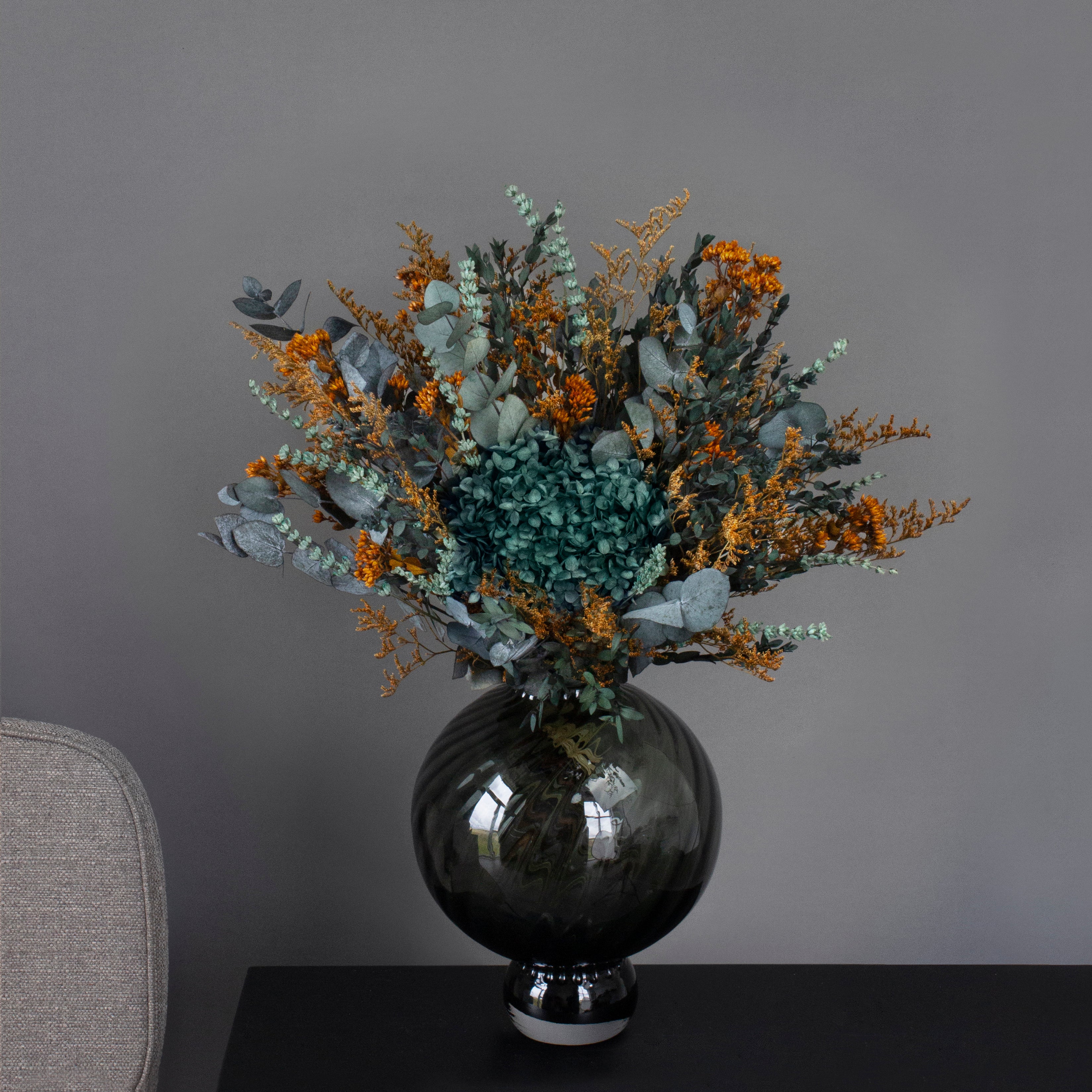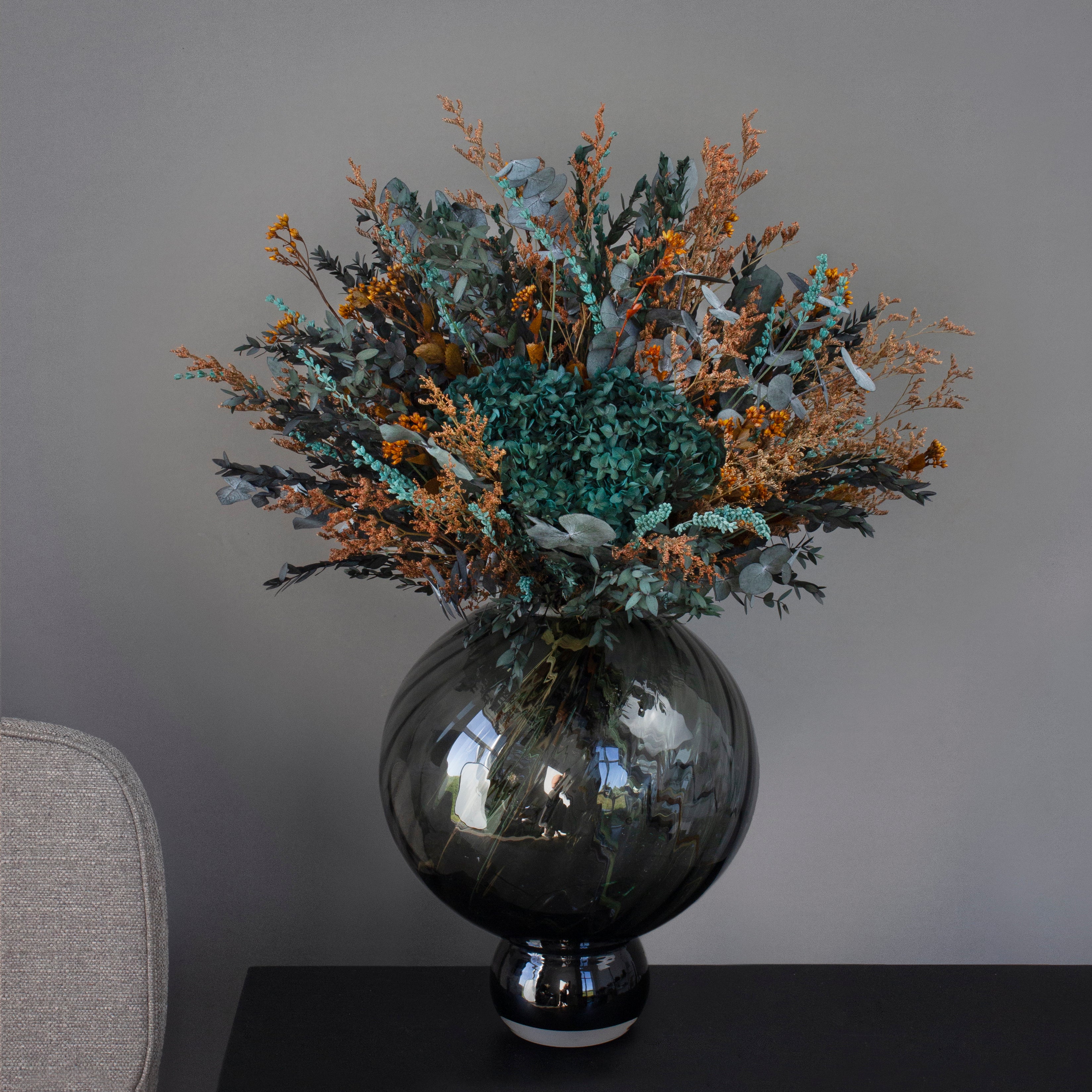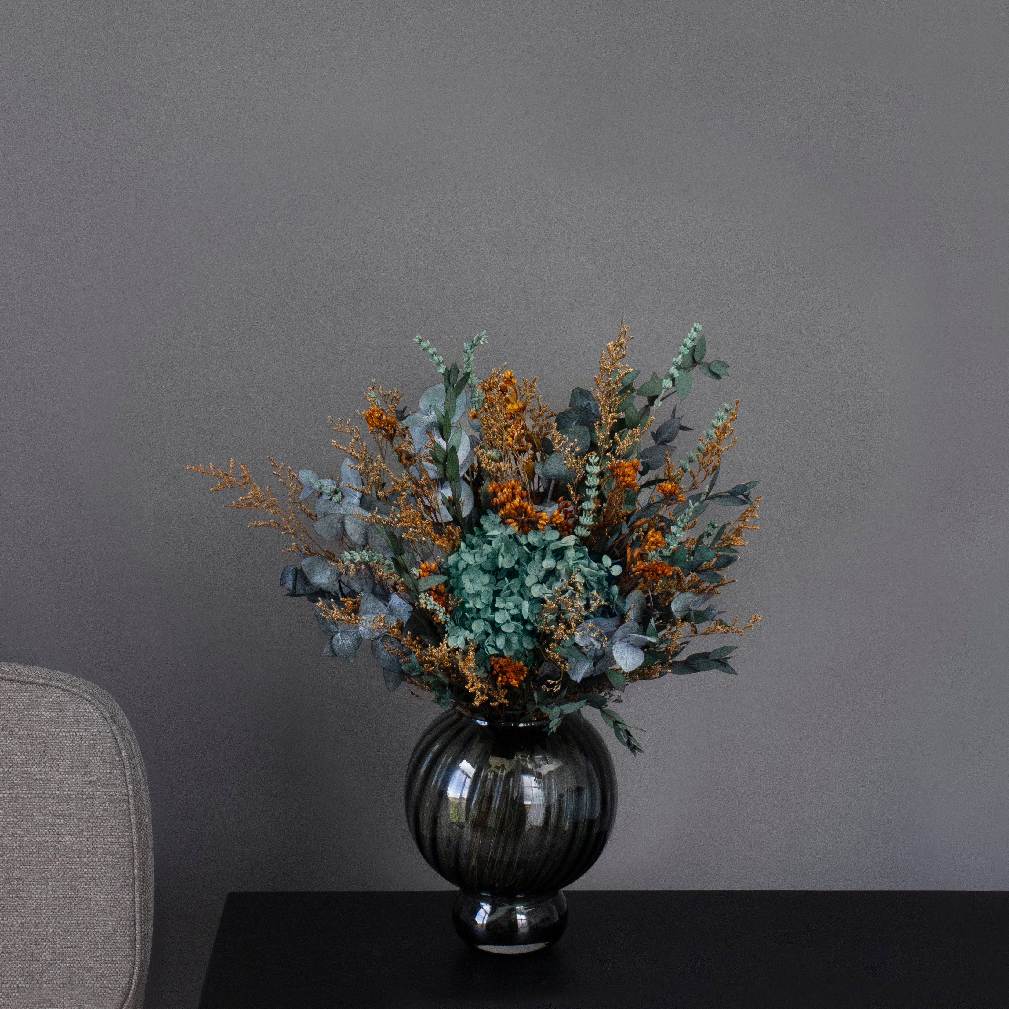 Denne eksklusive buketten kombinerer varme nyanser av kobber, mørk oransje og grønt for å skape et levende, men likevel balansert uttrykk som tilfører både dybde og eleganse til hjemmet ditt. Vær oppmerksom på at den bedårende hortensiaens farge kan variere i støvgrønne og blålige toner.