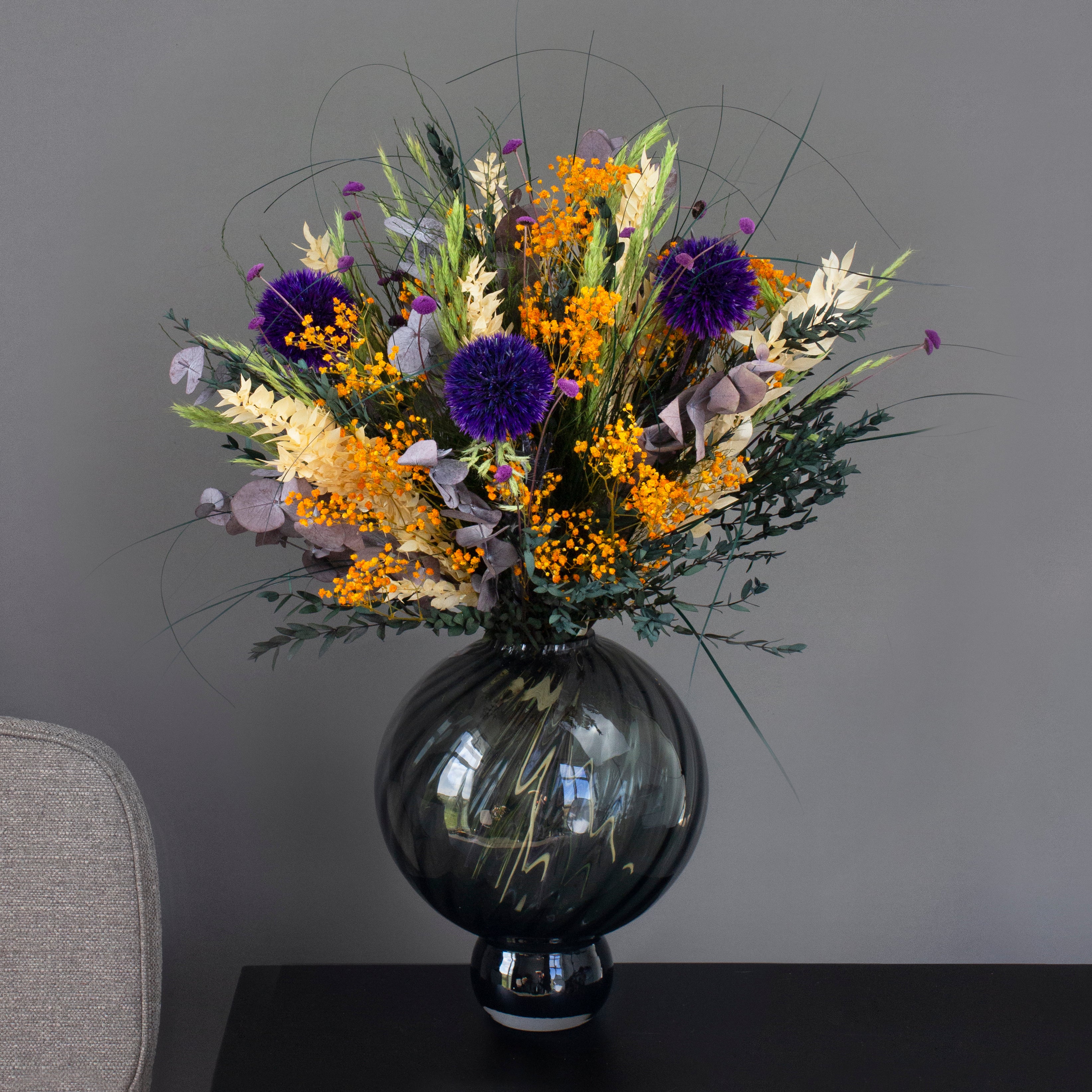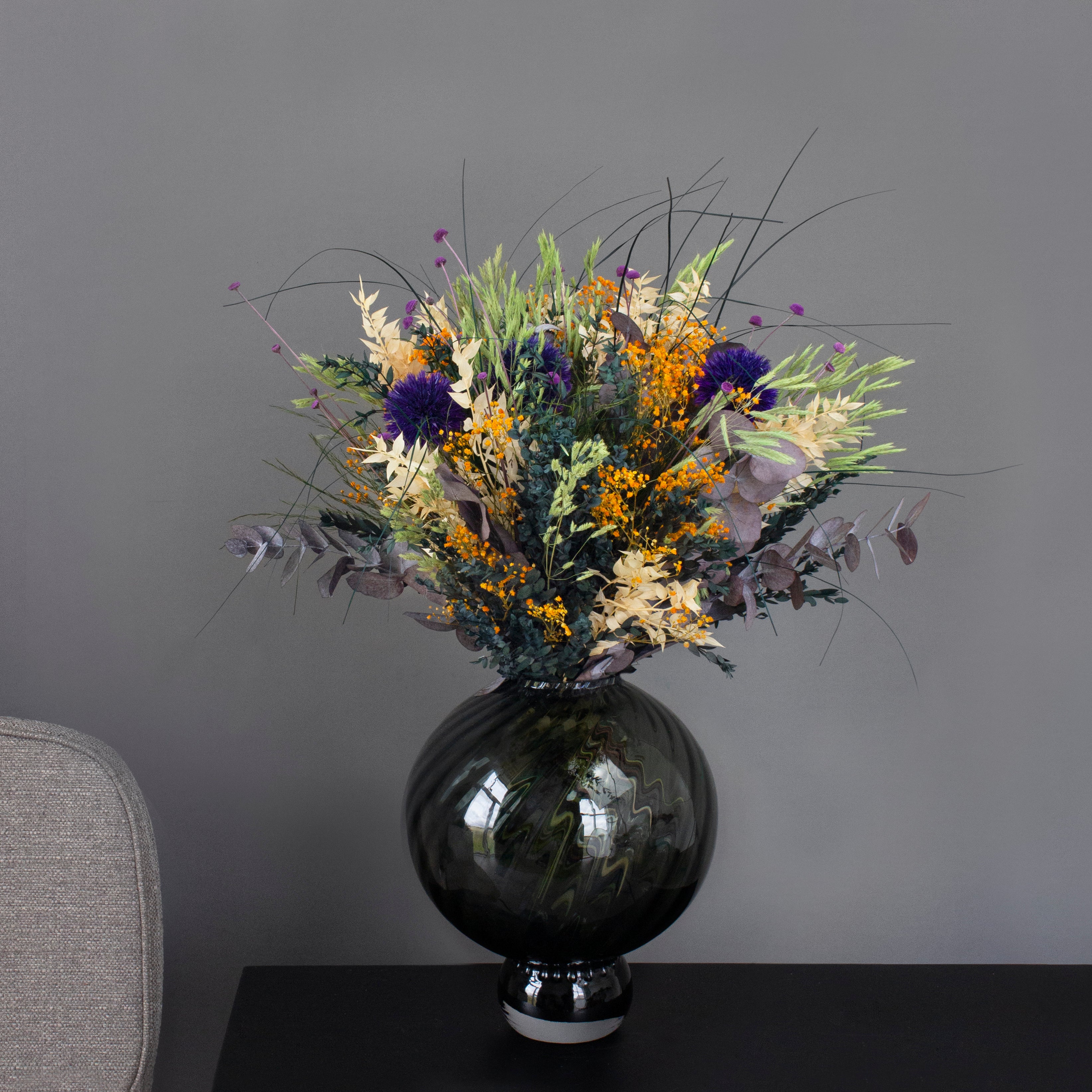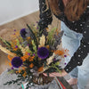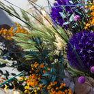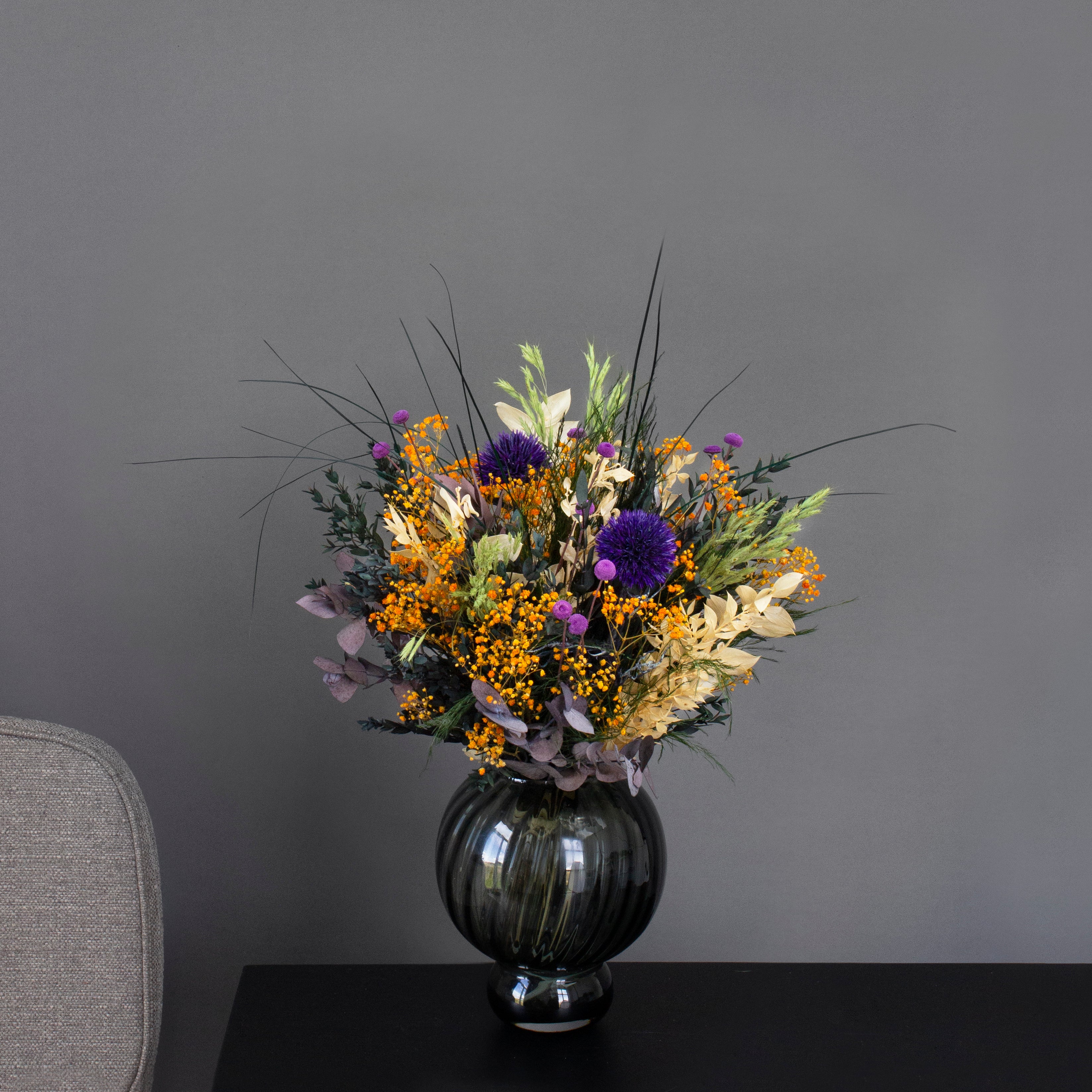 Ta med deg naturens rå skjønnhet og varme inn i hjemmet med denne kraftfulle buketten - en langtidsholdbar bukett fylt med energi, farger og personlighet. Oransje brudeslør, lilla tistelkuler, eukalyptus og tørket gress samles i et vilt, organisk uttrykk der naturens ville side møter tidløs estetikk.