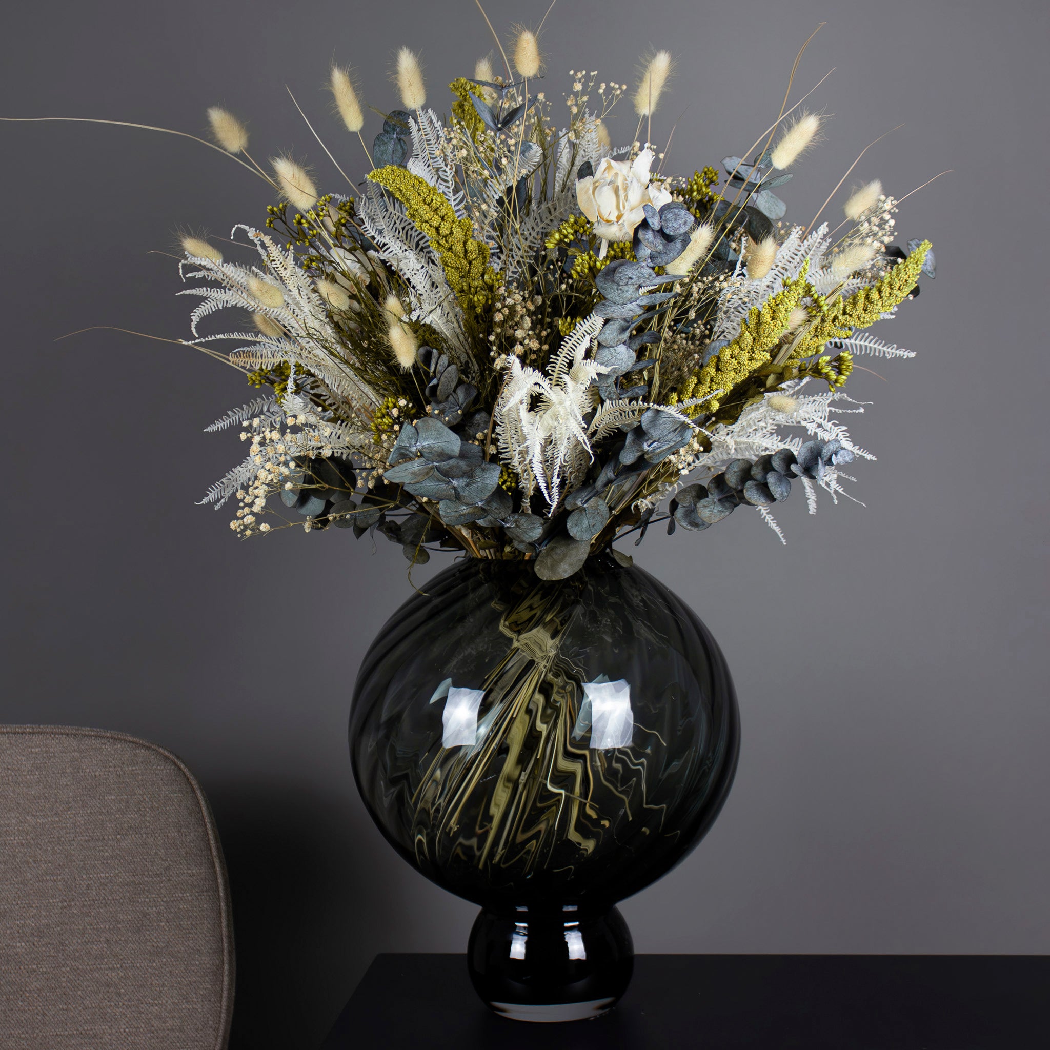 Denne flotte buketten er bundet sammen av en skjønn miks av bærekraftige blomster – Eucalyptus Espiral, Esparraguera Trifle, Setaria, Chuvisco og det kendte Gypsophila Paniculata, samt de tørkede blomstene Lagurus, Bright Grass og Palm Cap.