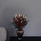 I denne magiske årstiden kan du fortrylle hjemmet ditt med en bukett full av julestemning. Bukett Julemagi er designet for å fylle hjemmet ditt med ekte julestemning. Denne buketten kombinerer dyprøde blomster, grønne toner og naturlige kongler, som sammen skaper en koselig og elegant julestemning.