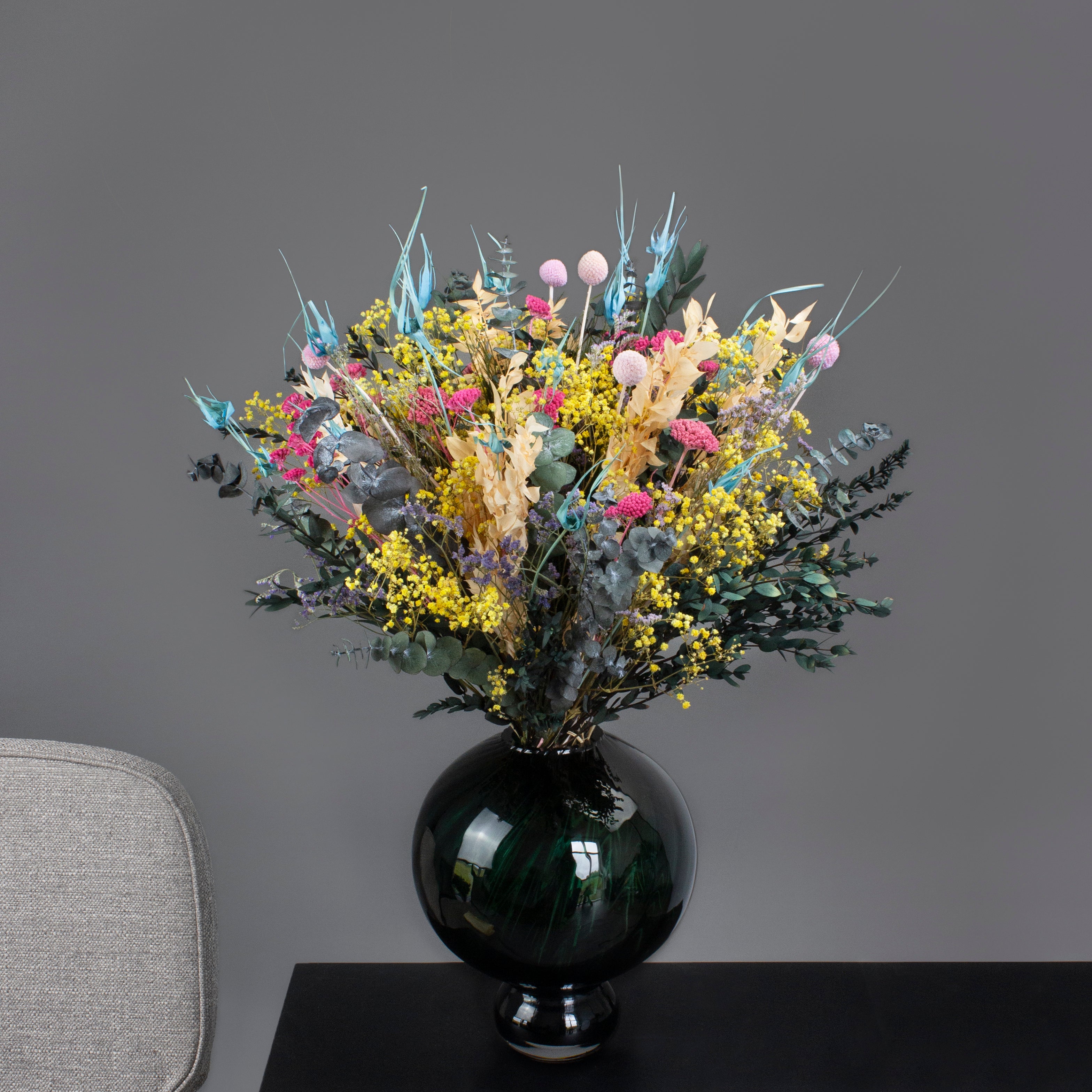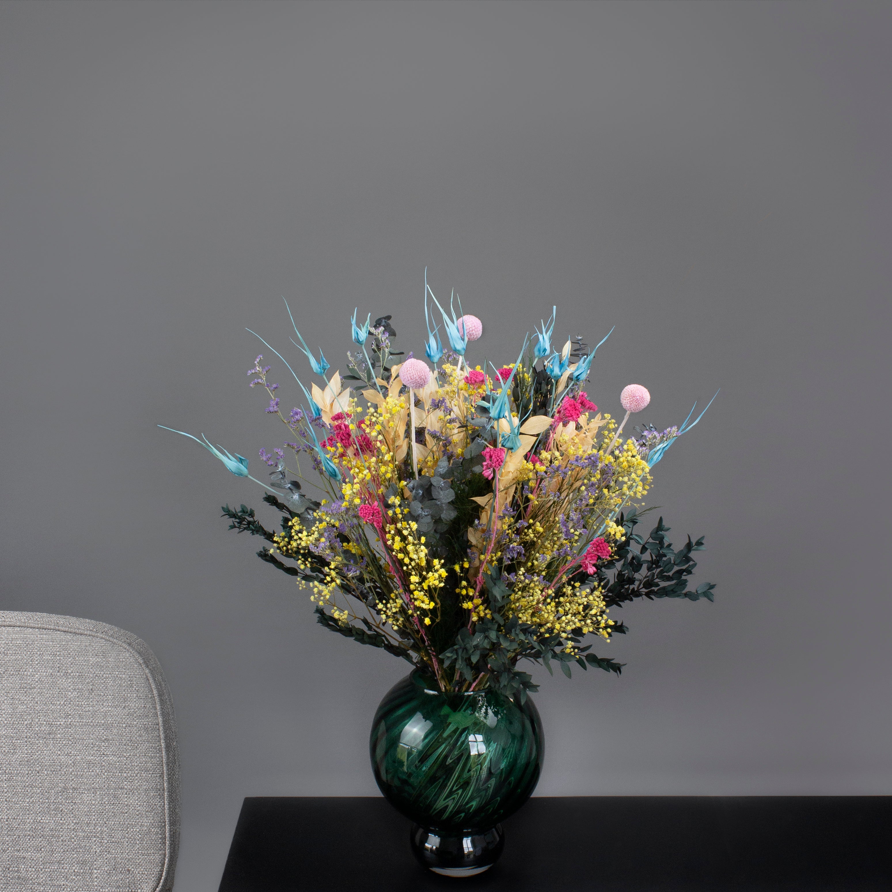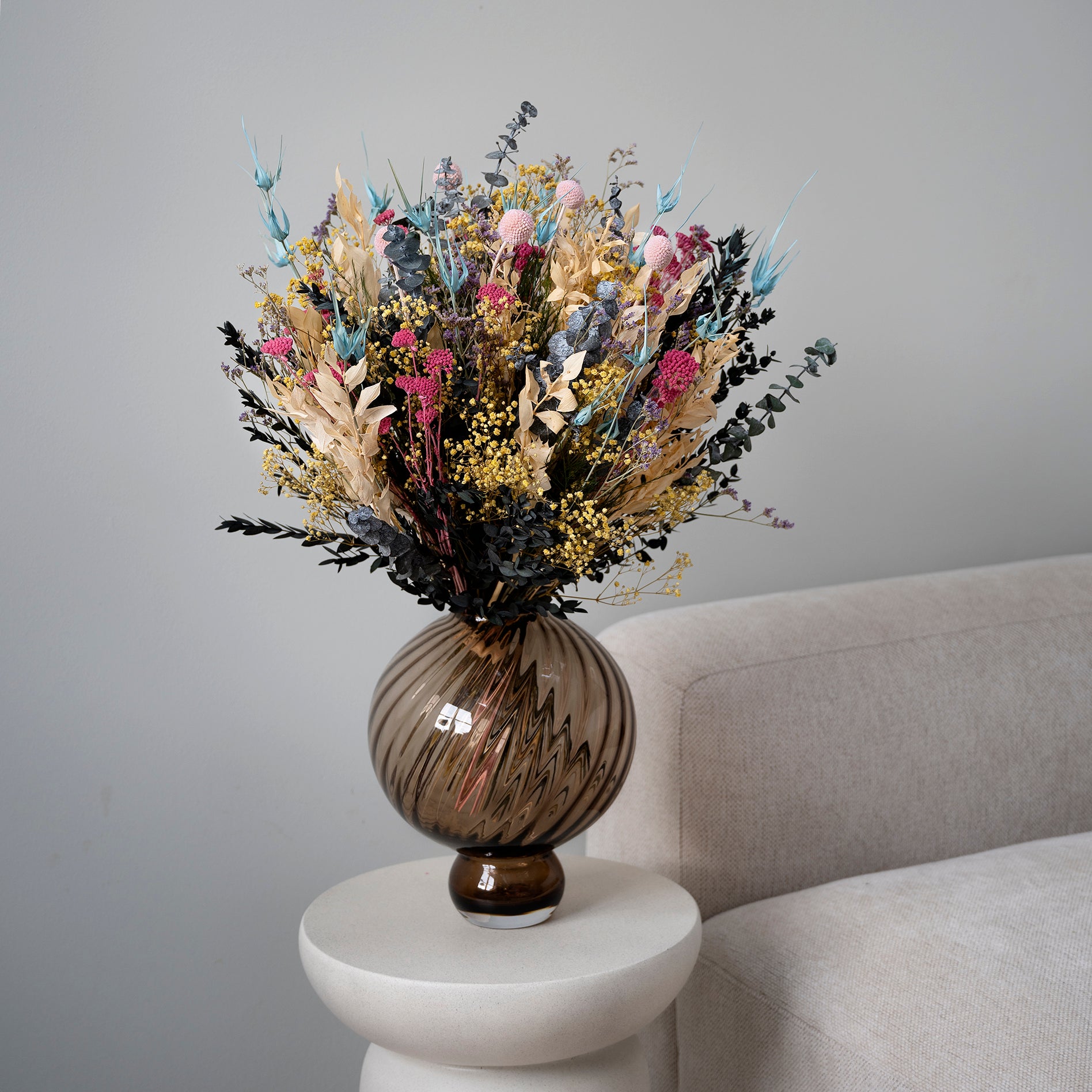 Skap en lys og leken atmosfære i hjemmet ditt med vår blomsterbukett. Plasser buketten i en glassvase eller en håndlaget keramikkvase i stuen, på spisebordet eller som blikkfang på en bokhylle.