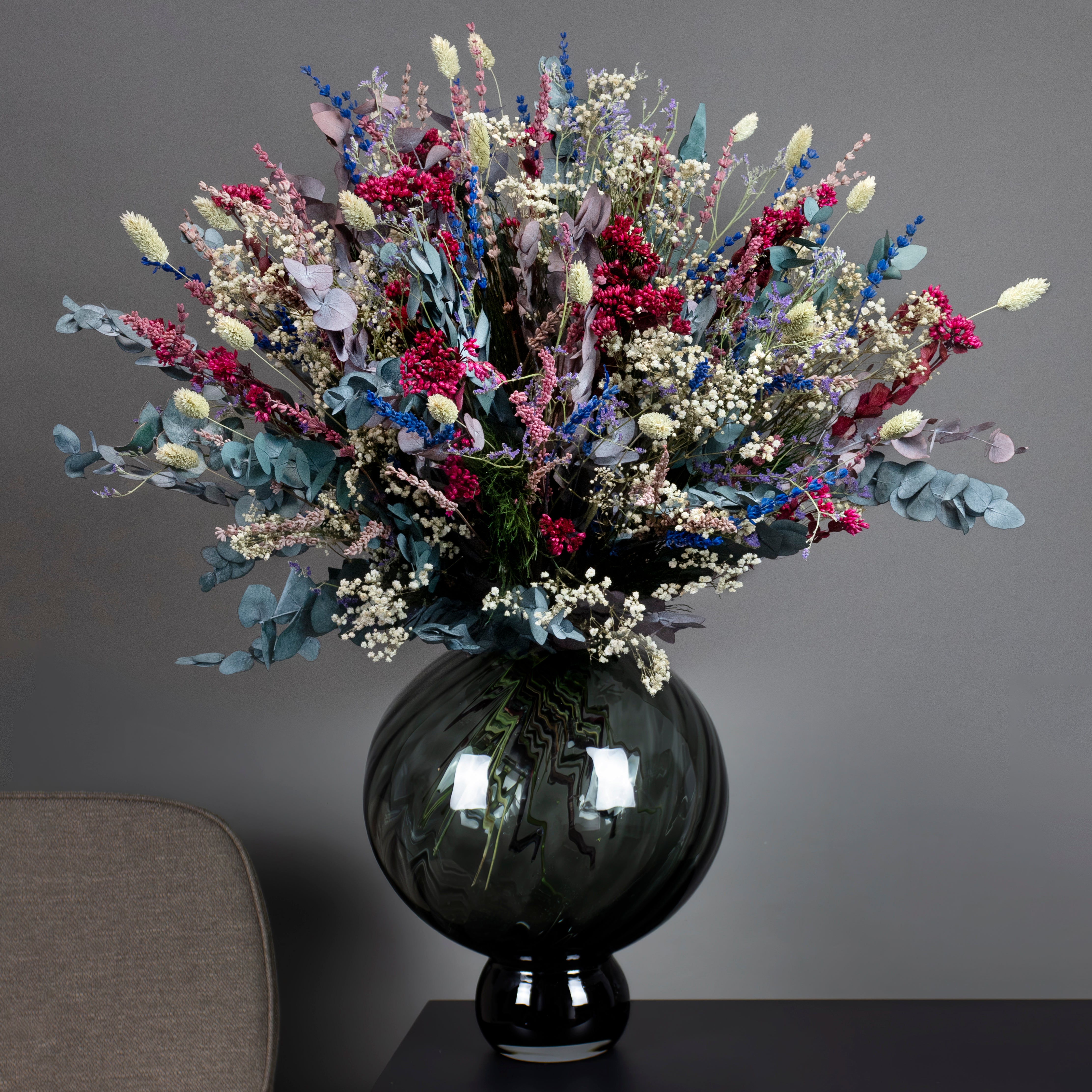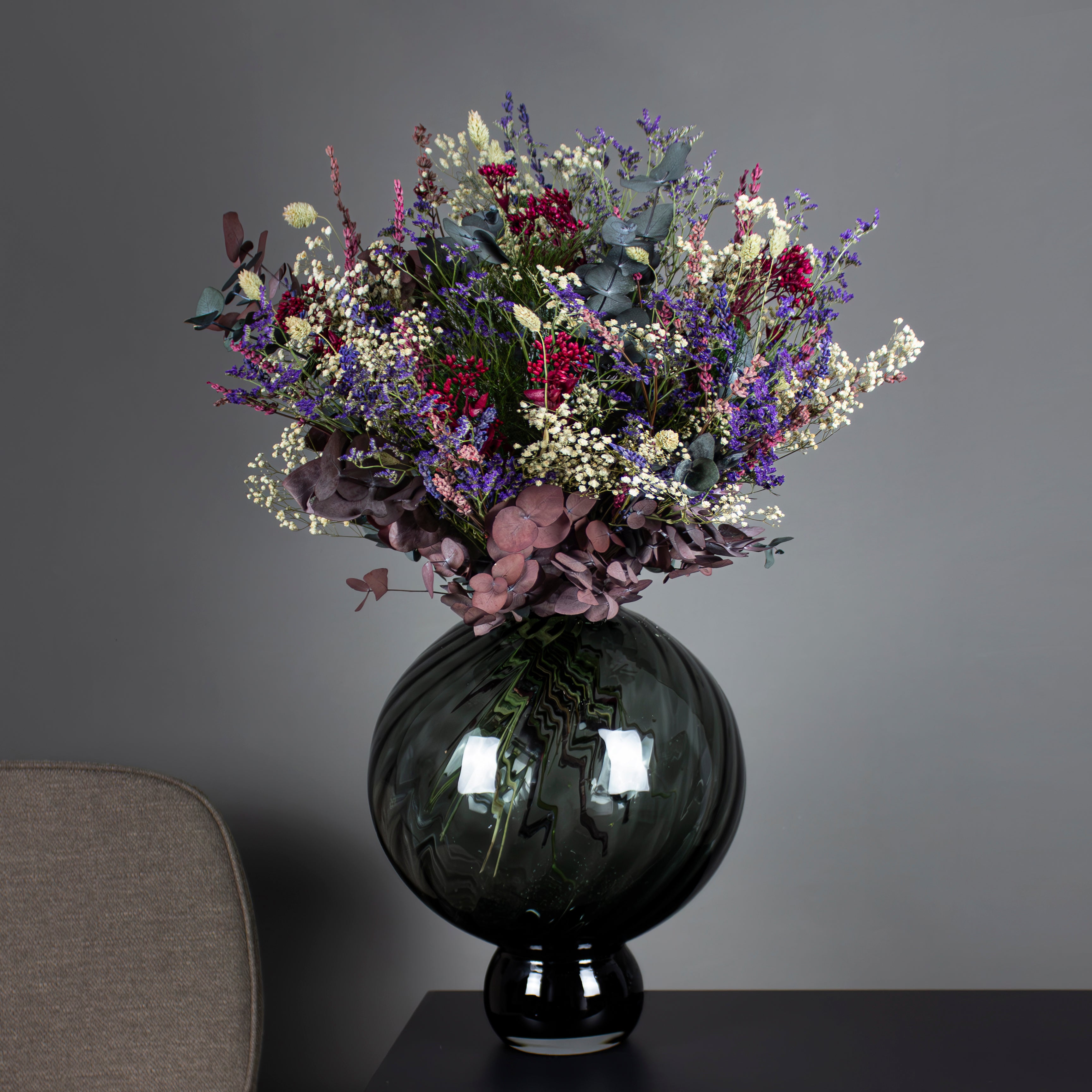 Denne bukettstørrelsen krever god plass – vi anbefaler brede og runde vaser med en høyde på 30–55 cm.