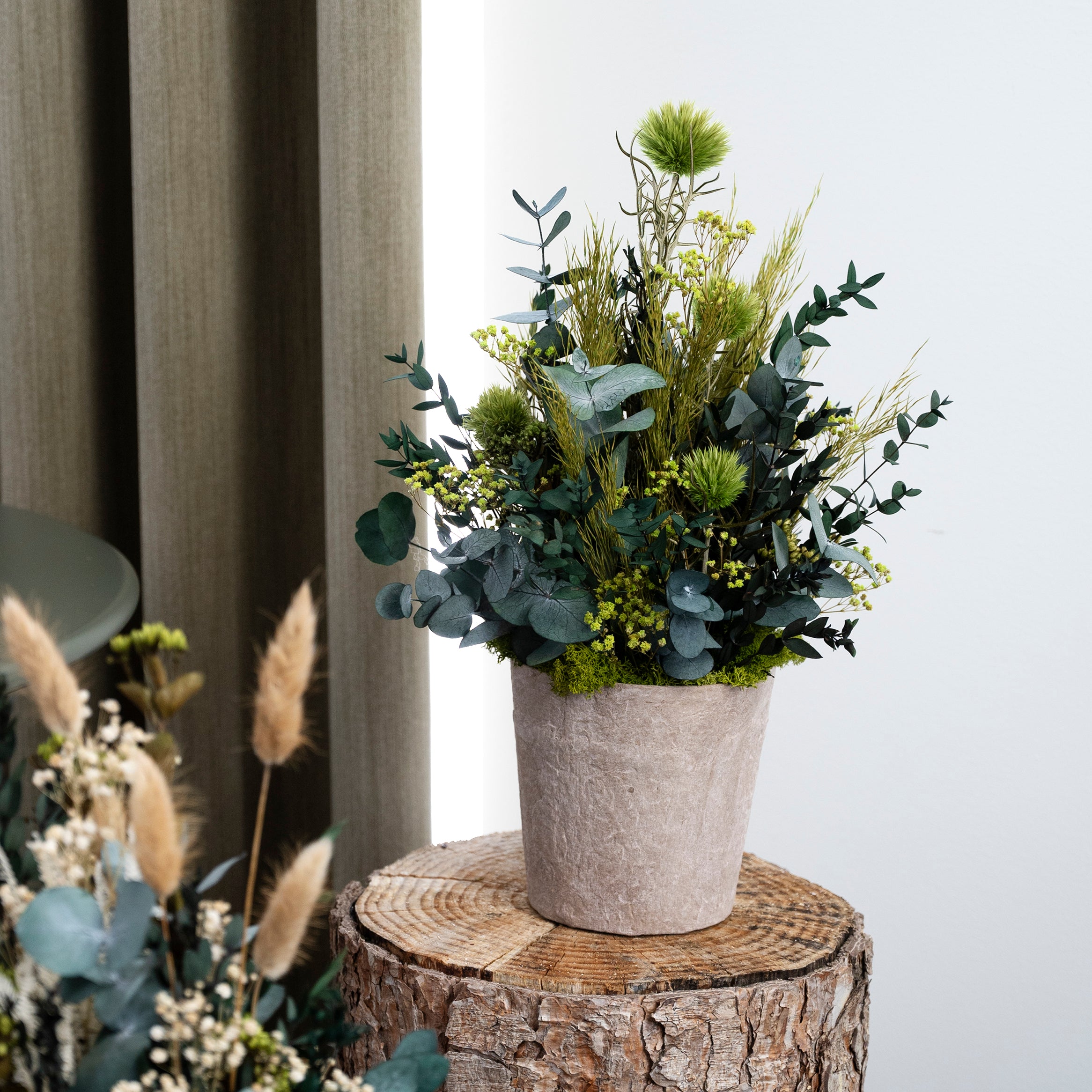 Dekorasjonen leveres i en moderne potte som gir et enkelt og nordisk uttrykk. Den passer vakkert på spisebordet, i vinduskarmen, på kontoret eller i entréen – der du ønsker et grønt element uten vedlikehold.