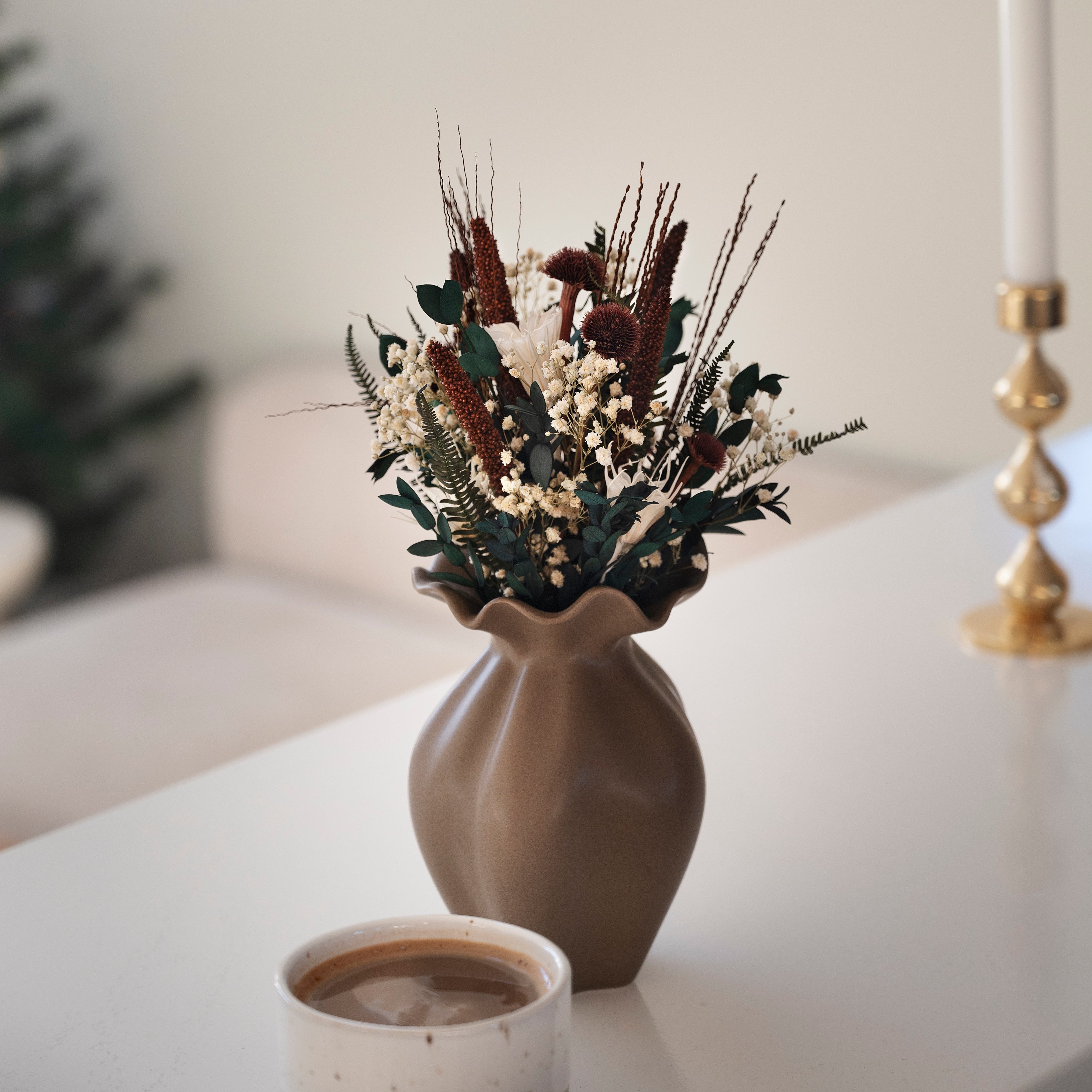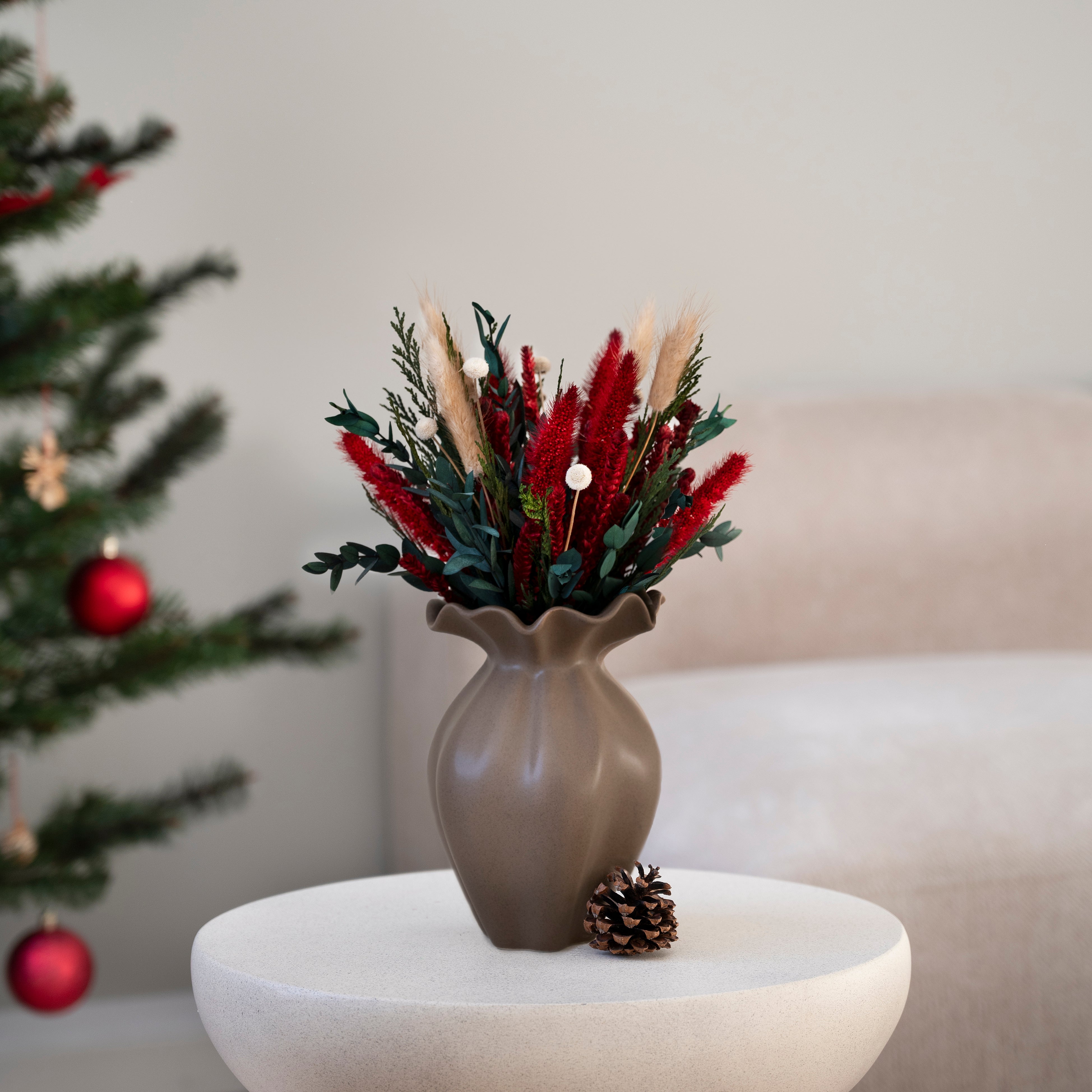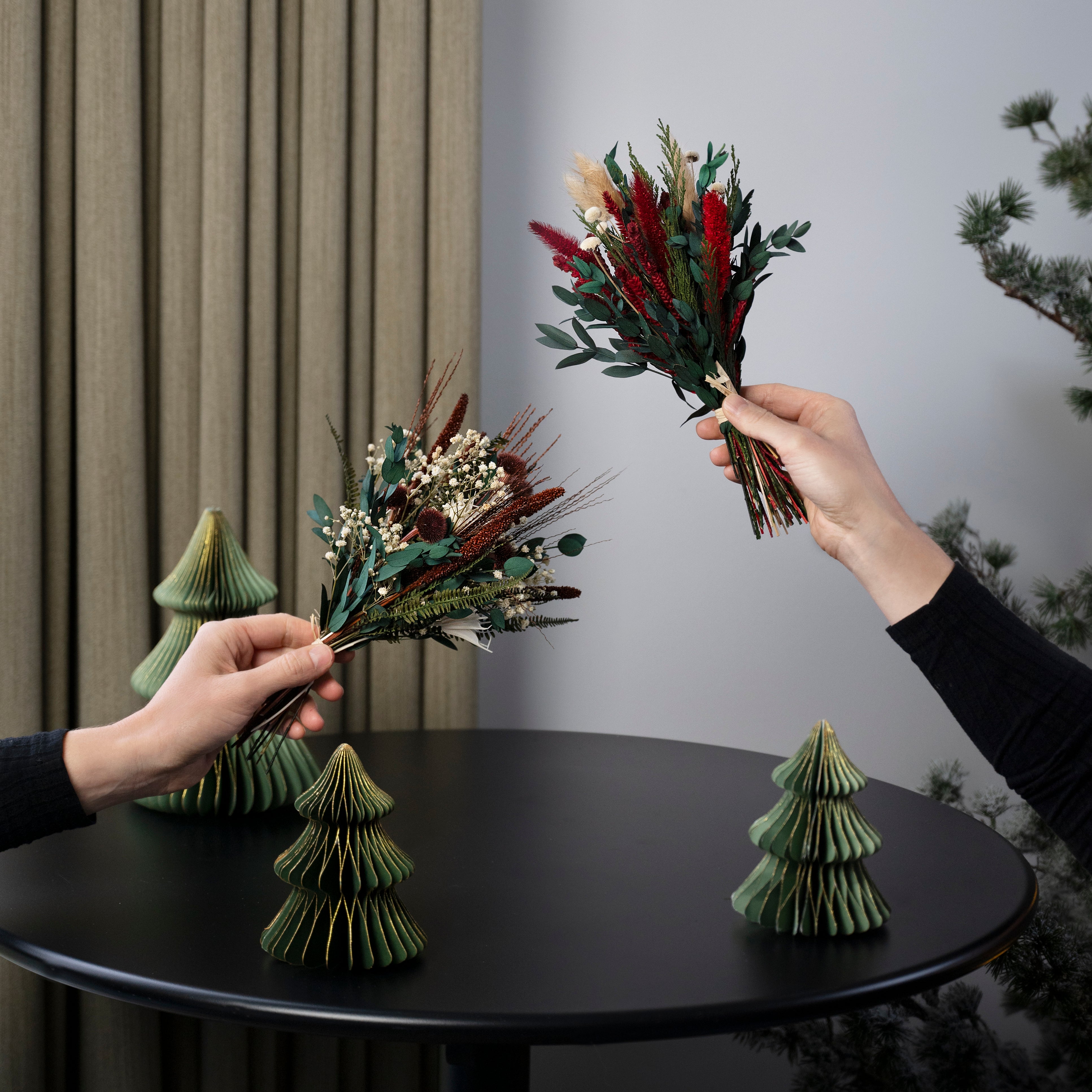 De små bukettene er inspirert av våre populære julekolleksjoner og kombinerer klassiske farger, vinterlige nyanser og naturlige materialer. De holder i minst 6 måneder uten vann og gir et vakkert, stemningsfullt uttrykk i hjemmets små kroker.