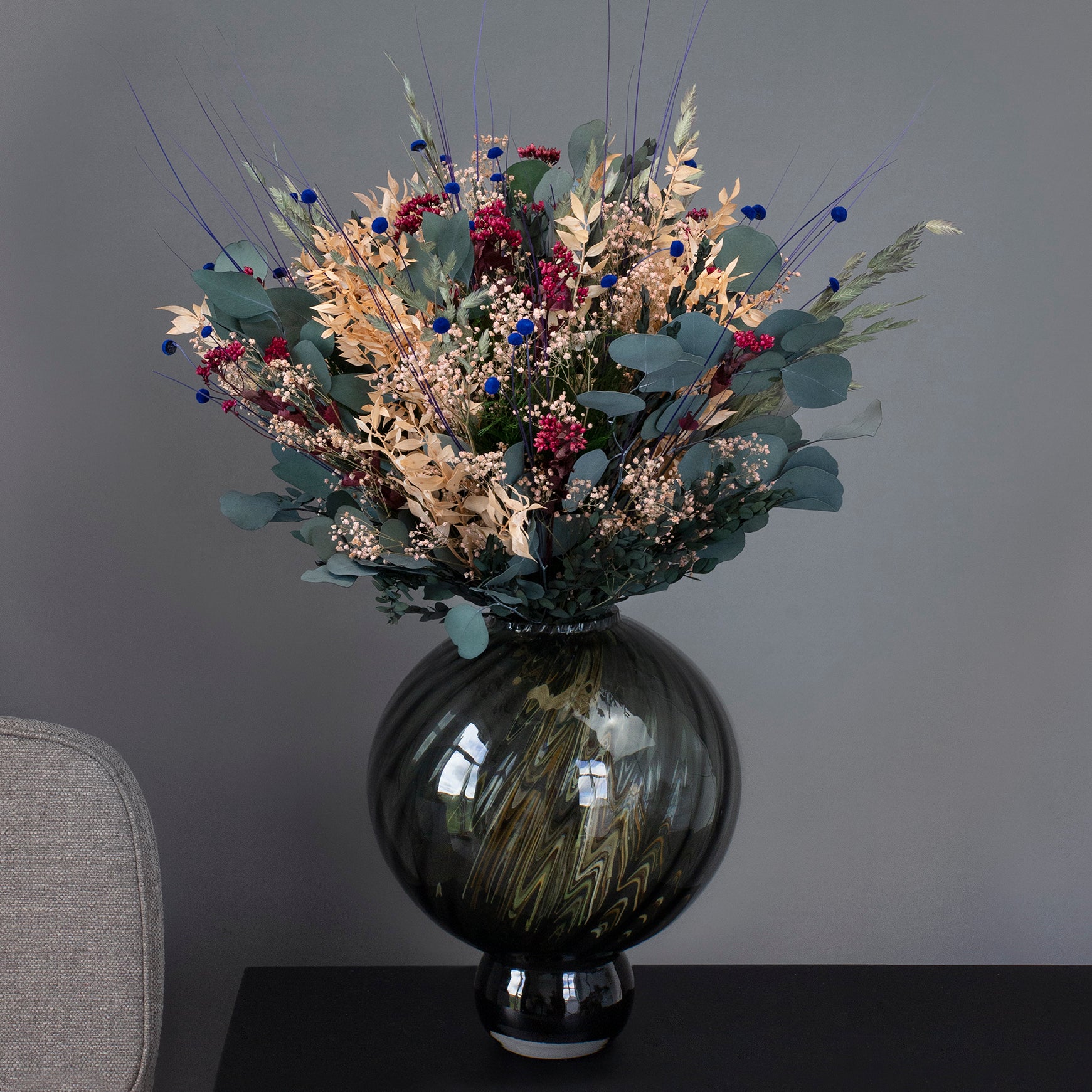 Pompøs - Størrelse Pompøs har en høyde på 60-65 cm og er minst 150 % større enn størrelsen Naturligvis. Denne bukettstørrelsen er perfekt for en stor kjøkkenøy eller gulvvase. Vi anbefaler brede og runde vaser med en høyde på 30-55 cm.